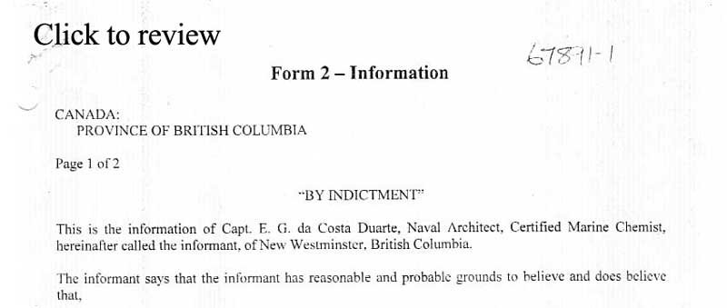 The events involving the vessel renamed El Conquistador, herein described, reflect approximately TWO THOUSAND pieces of paper, exhibiting; letters, faxes, documents, certificates, court applications, ship drawings, court transcripts, and stability data. In Addition, approximately TWELVE HOURS of recorded interviews with witnesses and graphic information released from United States of America, Homeland Security, all add testimony to the severity of neglect and criminal activity displayed by Canadian Government officials, namely a member of the RCMP, Sgt. Mark G. Peers and five officials of Transport Canada, James Lawson, Brian Kenefick, Colin Currivan, David Motion and Goeff Sedan.